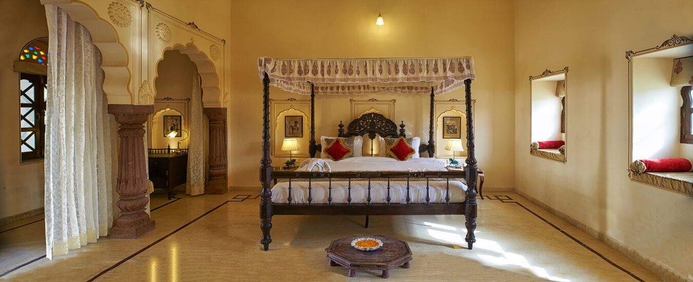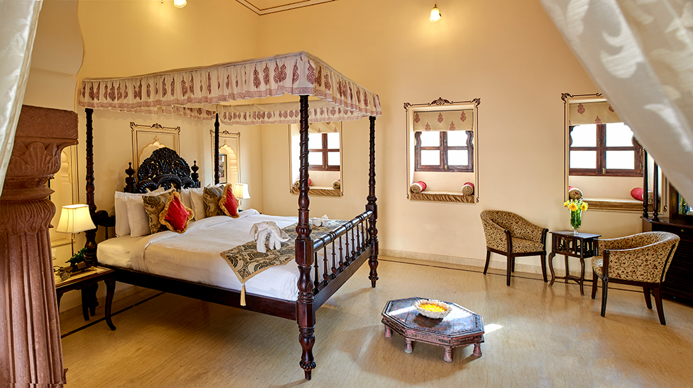 The room amenities at Pratap Niwas Resort include a four-poster bed, sitting area, mini bar, tea/coffee maker, air conditioner, intercom, ironing board, attached toilet, television, open balcony, hand-painted flowers and Wi-Fi.